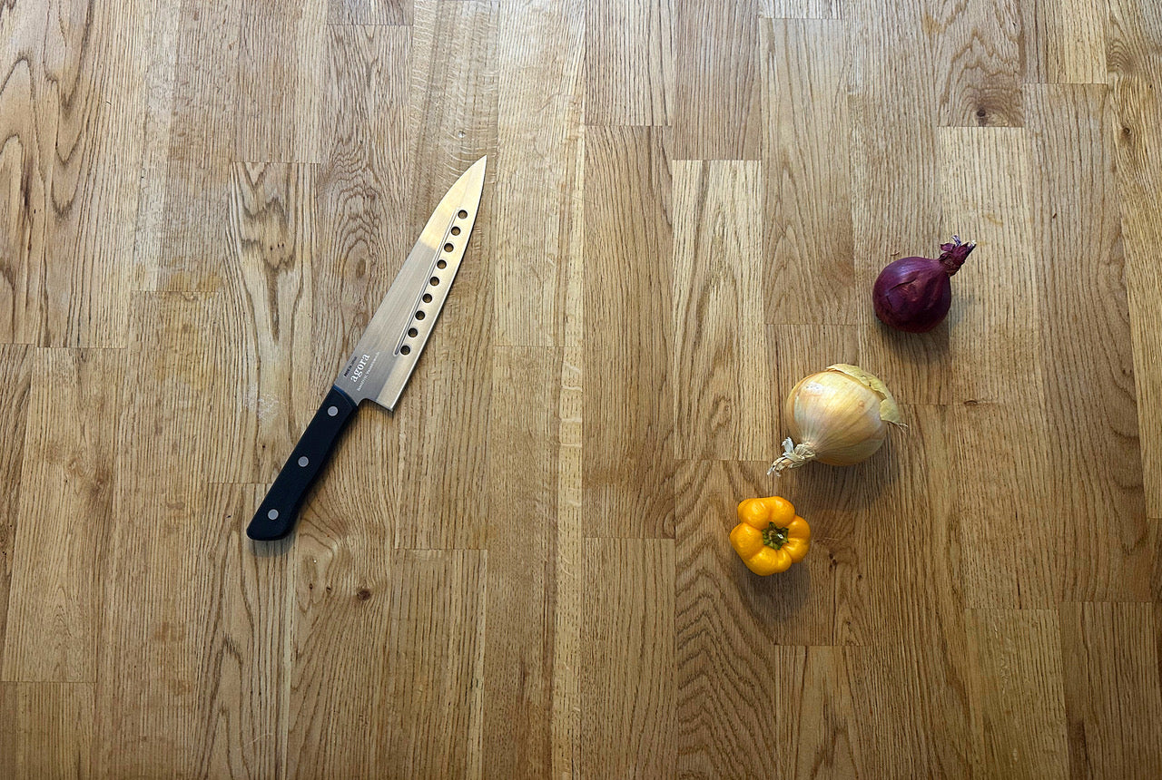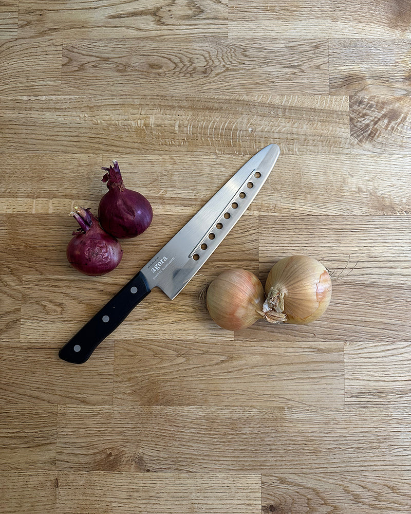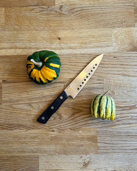Hålen och falsen på knivbladet gör att skivor av till exempel grönsaker, frukt och charkuterier lättare lossnar och arbetet underlättas.